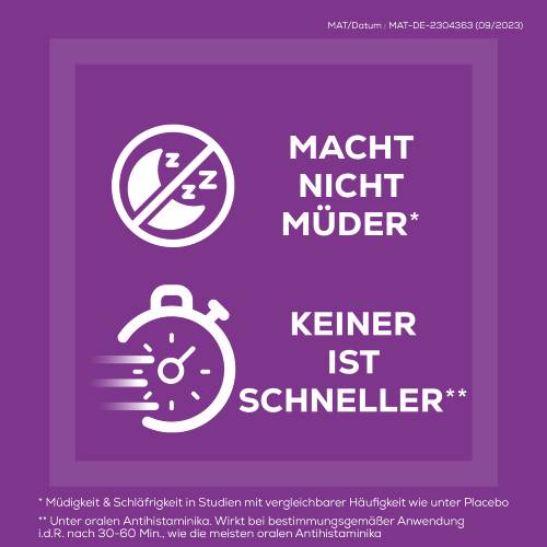 - KEINER IST SCHNELLER** bei allergischen Symptomen an Nase, Augen und Haut. Zur Anwendung bei Heuschnupfen (Pollen-), Hausstaub-, Schimmelpilz- und Tierhaar-Allergie sowie Juckreiz durch Nesselsucht (Urtikaria).