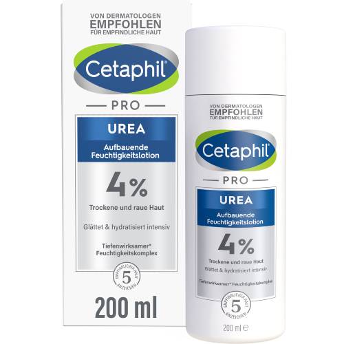 Cetaphil PRO Urea 4% aufbauende Feuchtigkeitslotion ist eine reichhaltige Pflege für trockene und raue Haut. Dank der besonders reichhaltigen Formulierung kann der natürliche Feuchtigkeitskomplex aus Urea & Laktat eine besonders tiefenwirksame & langanhaltende Wirkung entfalten. Der Wassergehalt der Haut wird sofort und langanhaltend erhöht, gleichzeitig stärken wertvolle Lipide die natürliche Hautbarriere und helfen so, die Haut vor dem Austrocknen zu schützen. So wird Ihre Haut hydratisiert, gepflegt und geglättet, die Hautbarriere gestärkt und die Regeneration der Haut unterstützt. Für ein angenehme glattes, weiches und gesundes Hautgefühl, mit dem Sie sich wieder wohl fühlen. Auch in der Begleitpflege von Neurodermitis oder altersbedingter Xerose geeignet und klinisch getestet.