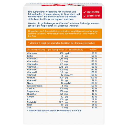 Doppelherz A–Z Brausetabletten enthalten sorgfältig aufeinander abgestimmte Vitamine, Mineralstoffe und Spurenelemente – von Vitamin A bis Zink. Eine ausreichende Versorgung mit Vitaminen und Mineralstoffen ist Voraussetzung für Gesundheit
