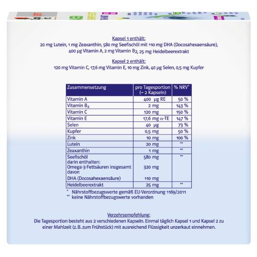 Kapsel 1 trägt mit Vitamin A zum Erhalt der normalen Sehkraft bei. Zusätzlich ist die Omega-3-Fettsäure DHA in Kombination mit Lutein, Zeaxanthin und Heidelbeerextrakt enthalten. Das fettlösliche Vitamin A und das wasserlösliche Vitamin B2 leisten einen Beitrag zum Erhalt der normalen Sehkraft. Vitamin B2 trägt zum Erhalt der normalen Schleimhäute bei. Lutein und Zeaxanthin kommen vor allem in pflanzlichen Lebensmitteln (z. B. grünem Gemüse) vor. Der so genannte „Gelbe Fleck“ der Netzhaut enthält eine hohe Konzentration an Lutein und Zeaxanthin. Der „Gelbe Fleck“ liegt in der Mitte des Augenhintergrundes. Heidelbeeren sind eine beliebte Beerensorte in der menschlichen Ernährung. Sie wurden bereits vor Jahrhunderten in den Wäldern und Mooren Europas gesammelt und wegen ihrer Inhaltsstoffe geschätzt. Die Omega-3-Fettsäure DHA (Docosahexaensäure) kommt in den Sehzellen der Netzhaut vor. Die Kapseln von Doppelherz system enthalten eine besonders hohe Konzentration an Omega-3-Fettsäuren. Das Omega-3-Konzentrat erreicht einen Omega-3-Fettsäuren-Anteil von 55 %. In herkömmlichen Fischölprodukten sind nur etwa 30 % enthalten. Dabei sind es gerade die Omega-3-Fettsäuren, die die Fischöle so wertvoll machen.