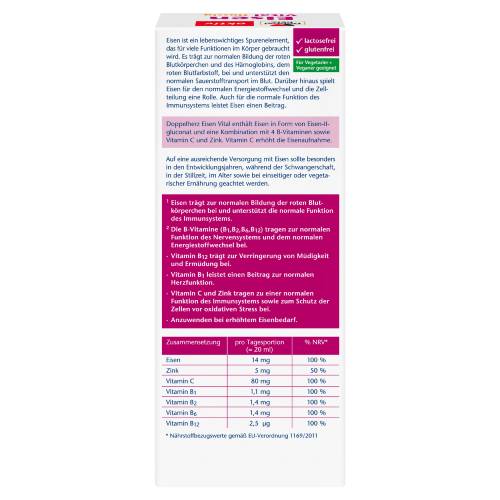Doppelherz Eisen Vital enthält Eisen in Form von Eisen-II-gluconat und eine Kombination mit 4-B-Vitaminen sowie Vitamin C und Zink. Dabei hat das Nahrungsergänzungsmittel einen fruchtigen Orangen-Apfel-Geschmack!