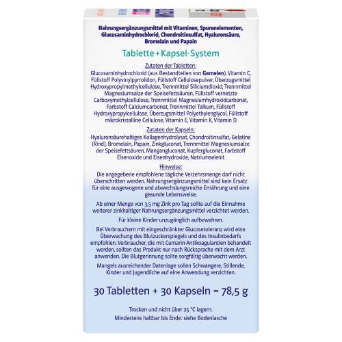 Zusätzlich sind 1200 mg Glucosaminhydrochlorid, 200 mg Chondroitinsulfat, 50 mg Hyaluronsäure sowie die Enzyme Bromelain und Papain enthalten.