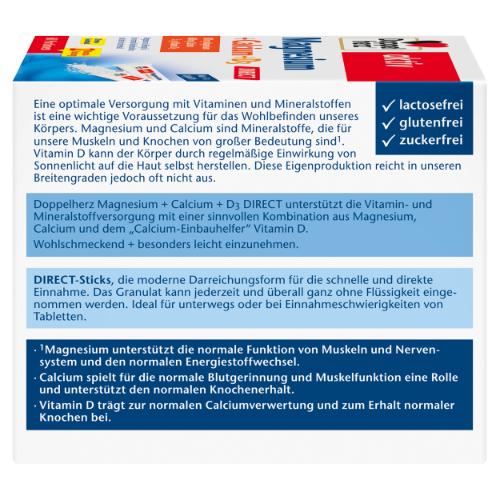 Eine optimale Versorgung mit Vitaminen und Mineralstoffen ist entscheidend für das allgemeine Wohlbefinden unseres Körpers. Magnesium und Calcium sind zwei essenzielle Mineralstoffe, die für die Aktivierung und Aufrechterhaltung zahlreicher biologischer Prozesse unerlässlich sind. Gemäß der deutschen "Nationalen Verzehrsstudie" von 2008 ist die Calciumversorgung in weiten Teilen der Bevölkerung nicht optimal. Doppelherz Magnesium + Calcium + D3 DIRECT bietet eine sinnvolle Kombination aus Magnesium, Calcium und dem "Calcium-Einbauhelfer" Vitamin D zur Unterstützung der Vitamin- und Mineralstoffversorgung. Das Produkt ist wohlschmeckend und besonders leicht einzunehmen. Es enthält Micro-Pellets, eine moderne Darreichungsform für eine schnelle und direkte Einnahme. Die feinen Granulatperlen können jederzeit und überall ohne Flüssigkeit eingenommen werden, was sie ideal für unterwegs oder bei Schwierigkeiten mit der Tabletten-Einnahme macht. Magnesium trägt zur Aufrechterhaltung des normalen Energiestoffwechsels sowie der normalen Funktion von Nervensystem und Muskeln bei. Calcium spielt eine Rolle bei der normalen Blutgerinnung und Muskelfunktion und unterstützt den Erhalt gesunder Knochen. Vitamin D trägt zur normalen Calciumverwertung und zum Erhalt normaler Knochen bei.