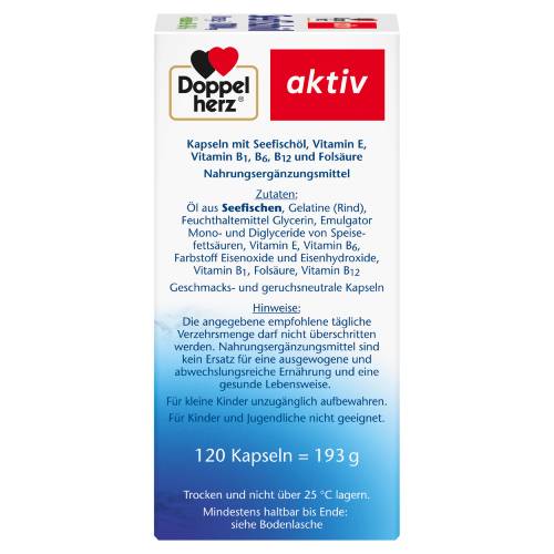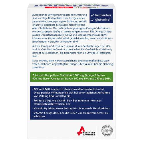 1 Kapsel Doppelherz Seefischöl Omega-3 1000 mg + Folsäure + B1 + B6 + B12 liefert bereits 180 mg EPA und 120 mg DHA. EPA und DHA spielen eine Rolle für die normale Herzfunktion.