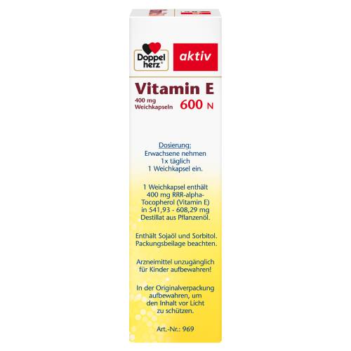 Vitamin E 600 N, Weichkapseln. Für Erwachsene. Wirkstoff: RRR-alpha-Tocopherol. Anwendungsgebiet: Zur Leistungssteigerung. Warnhinweise: Enthält Sojaöl und Sorbitol.