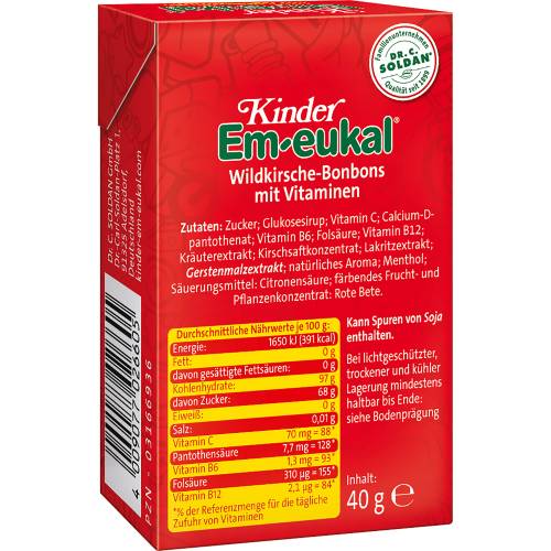 Wer kennt es nicht – das Kinder Em-eukal Bonbon mit dem typischen Wildkirschgeschmack? Das erste Vitamin-Husten-bonbon für Kinder überhaupt. Mit hochwertigen, natürlichen Zutaten und fünf sorgfältig ausgewählten Vitaminen. Klein, rund und lecker – für Groß und Klein.