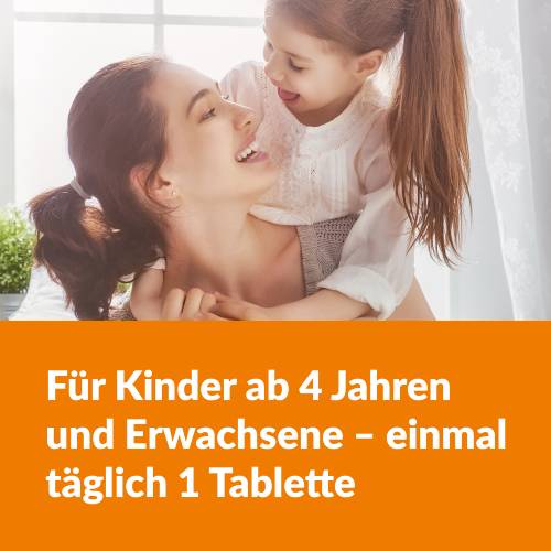 Kinder ab 4 Jahren lassen täglich eine Tablette nach einer Mahlzeit im Mund zergehen.