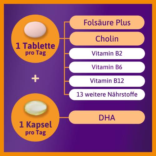 ZUGESCHNITTENE NÄHRSTOFFKOMBINATION: 400 μg Folat, Tablette enthält Omega 3 DHA, Cholin, Metafolin, Folsäure, Jod, B-Vitamine, Vitamin D, Vitamin E, Zink, Biotin, Niacin, Pantothensäure und Selen