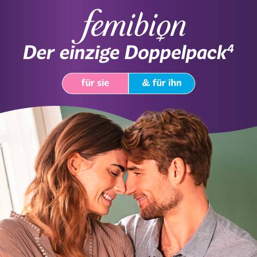 Femibion für sie & ihn ist ein praktischer Doppelpack mit zwei Produkten zur Unterstützung von Paaren bei der Vorbereitung der Empfängnis ab Kinderwunsch2,3 und zur Unterstützung der gesunden Entwicklung des Babys1 .
