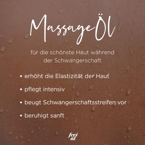 Wenn der Bauchumfang wächst und die Haut spannt, brauchen Schwangere eine besondere Hautpflege. Das frei öl® MassageÖl für Schwangere ist reich an aktiven Wirkstoffen, die die Haut unterstützen und pflegen. Vitamin E verstärkt die Dehnungsbereitschaft der Haut und erhöht die Elastizität. Omega 3- & 6-Fett-säuren aus pflanzlichen Ölen pflegen intensiv und Bisabolol beruhigt die beanspruchte, oft juckende Haut.