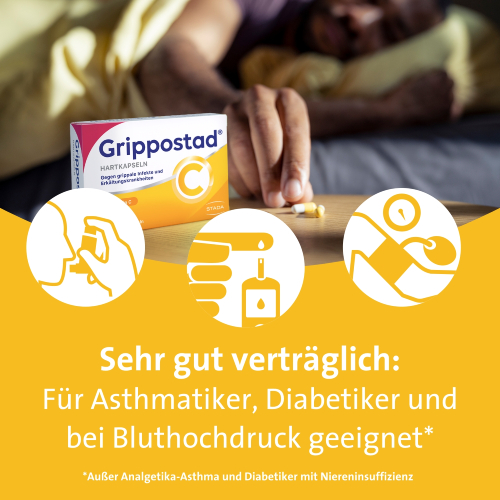 Erkältungen sind meist Virusinfektionen der Atemwege, die sich auf den ganzen Körper auswirken können. Viele Erkältete leiden bei einer Erkältung gleichzeitig an Schnupfen, Kopf- und Gliederschmerzen, Husten und Fieber. Alle diese Erkältungsbeschwerden gemein- sam können mit einem Kombi-Präparat bekämpft werden. Grippostad® C Kapseln sind Deutschlands meistverwendete Erkältungsmedizin bei Erkältungskrankheiten und grippalen Infekten. Sie enthalten eine Kombination aus Paracetamol, Chlorphenaminmaleat, Vitamin C und Coffein. Sie wirken gegen Reizhusten, Erkältungsfieber, Kopf- und Gliederschmerzen und Schnupfen in einem und lindern schnell diese gemeinsam auftretenden Erkältungssymptome. Die Dosierung der Wirkstoffe ist so abgestimmt, dass mit einem Minimum an Wirkstoff ein Maximum an Wirkung erzielt wird. Die Kapseln sind auch für Patienten mit Bluthochdruck, Asthma und Diabetes* geeignet.