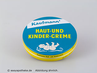 Kaufmanns Haut- und Kindercreme wird angewandt bei empfindlicher Haut. Die Creme enthält Vaseline, Lanolin, Zinoxid, Zitronenöl, Vanilleöl und Fliederöl. Durch die wertvollen Öle und Fette fördert sie die Entwicklung einer makellosen Haut. Besonders der empfindlichen Babyhaut fehlt der Schutzmantel gegen Bakterien und Schadstoffe. Hier hilft die Creme durch die Bildung eines Schutzfilms auf der Haut, die zarte Babyhaut vor solchen Umwelteinflüssen zu schützen. Auch im Windelbereich ist Kaufmanns Haut- und Kindercreme sehr hilfreich beim Schutz vor Nässe und Wundwerden. Die Creme kann mit ihrer wohltuenden Wirkung auch von Erwachsenen angewendet werden.