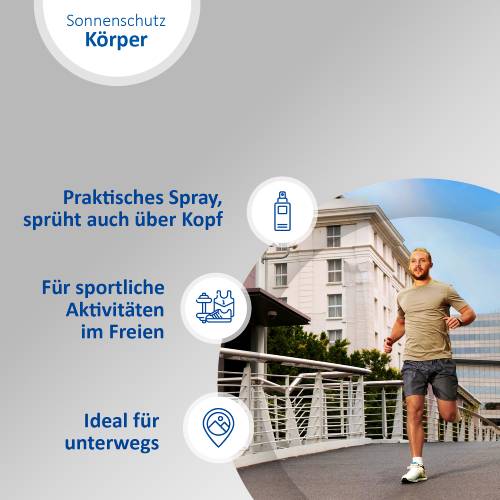 Tragen Sie das Sonnenschutz-Spray vor dem Sport großzügig auf Ihren ganzen Körper auf. Achten Sie besonders auf Nase, Lippen, Ohren, Schultern, Dekolleté, Fußrücken und unbehaarte Kopfhaut. Um den Schutz aufrechtzuerhalten, alle zwei Stunden sowie nach dem Baden und Schwitzen nachsprühen. Zu wenig Sonnenschutzmittel verringert den Lichtschutzfaktor.