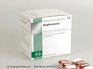 Die Dosierung richtet sich stets nach dem Schwergrad der stoffwechselbedingten Übersäuerung des Blutes. Soweit nicht anders verordnet, beträgt die Dosierung 6-9 magensaftresistente Weichkapseln Nephrotrans pro Tag, entsprechend 3 - 4,5g Natriumhydrogencarbonat pro Tag.