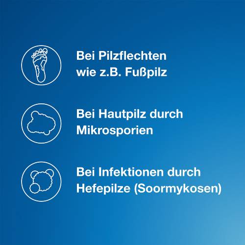 Ohne ärztlichen Rat sollten Sie das Arzneimittel nicht länger als 2 Wochen anwenden, wenn keine Besserung der Beschwerden nach dieser Zeit eingetreten ist. Die Anwendung sollte nach eingetretener Beschwerdefreiheit noch mindestens einige Tage fortgesetzt werden. Die durchschnittliche Behandlungsdauer beträgt: bei Hefepilz-Infektionen 2-3 Wochen, bei Hautpilz-Infektionen 3-4 Wochen, bei Fußpilz 4-6 Wochen.
