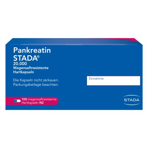 Wirkstoff: Pankreas-Pulver vom Schwein (Pankreatin) entsprechend 20.000 Ph.Eur.-Einheiten Lipase/Kapsel. Wird Zur Behandlung einer exokrinen Pankreasinsuffizienz angewendet. Hierbei produziert die Bauchspeicheldrüse nicht genügend Enzyme, um die Nahrung zu verdauen. Pankreatin STADA® kann bei Kindern, Jugendlichen und Erwachsenen angewendet werden. Die Behandlung mit Pankreatin STADA® verbessert die Symptome der exokrinen Pankreasinsuffizienz, einschließlich Stuhlkonsistenz (z.B. fettiger Stuhl), Bauchschmerzen, Flatulenz und Stuhlfrequenz (Durchfall oder Verstopfung). Wenn Sie sich nach 5 Tagen nicht besser oder gar schlechter fühlen, wenden Sie sich an Ihren Arzt.