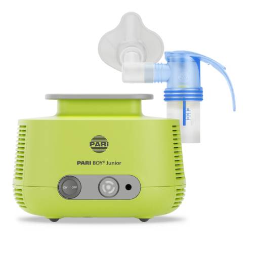 PARI BOY Junior (Typ 130), kompaktes Inhalationsgerät 220 – 240 V~/50 Hz inkl. PARI LC SPRINT Junior Vernebler mit PIF-Control (Düsenaufsatz gelb) und zusätzlichem Düsenaufsatz rot, BABY Winkel, PARI BABY Maske Größe 2, Mundstück universell und Anschlussschlauch lang (f/m).