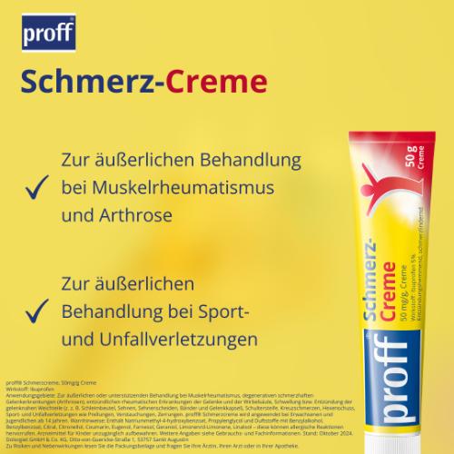 proff® Schmerzcreme – Seit 1983 in Deutschland zugelassen Schmerzen in Muskeln oder Gelenken können den Alltag stark einschränken. proff® Schmerzcreme wird äußerlich angewendet und wirkt lokal am betroffenen Bereich. Bereits seit 1983 in Deutschland zugelassen, zählt proff® Schmerzcreme zu den ersten topischen Arzneimitteln mit dem Wirkstoff Ibuprofen.