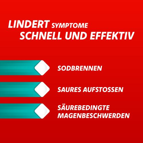 - schnelle Hilfe bei säurebedingten Magenbeschwerden wie Sodbrennen, saurem Aufstoßen, Völlegefühl und Magendruck