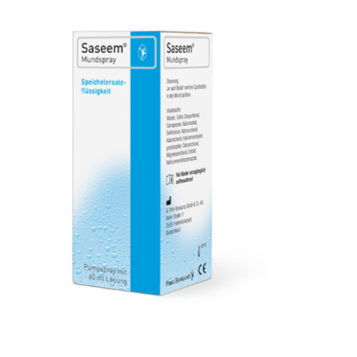 Saseem Mundspray Pumplösung ist eine Speichelersatzflüssigkeit zur intensiven Befeuchtung der Mundschleimhaut bei Mundtrockenheit und Störungen der Speichelproduktion. Der Mund- und Rachenraum wird mit einem schützenden und pflegenden Feuchtigkeitsfilm bedeckt.