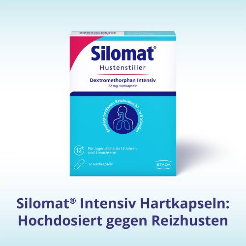 Dextromethorphan, der am besten untersuchte hustenstillende Wirkstoff der Welt, dämpft die Wahrnehmung des Hustenreizes, sodass sich die Schleimhäute in den Bronchien erholen und auch Sie wieder zur Ruhe kommen können. Die leicht zu schluckenden, geschmacksnutralen Silomat® Dextromethorphan Intensiv Hartkapseln sind mit 30mg hochdosiert und wirken bereits nach 15-30 Minuten bis zu 6 Stunden.