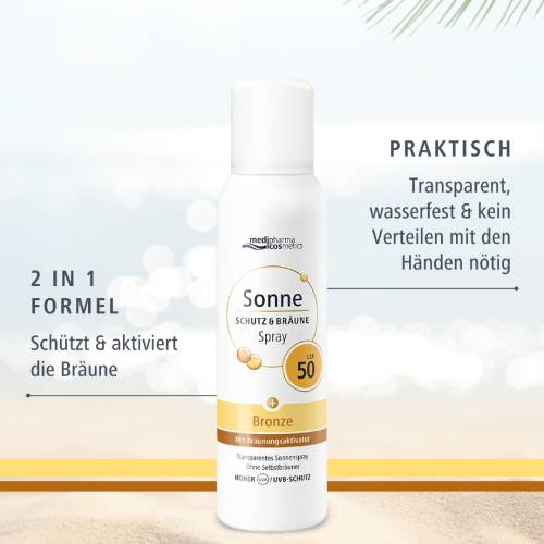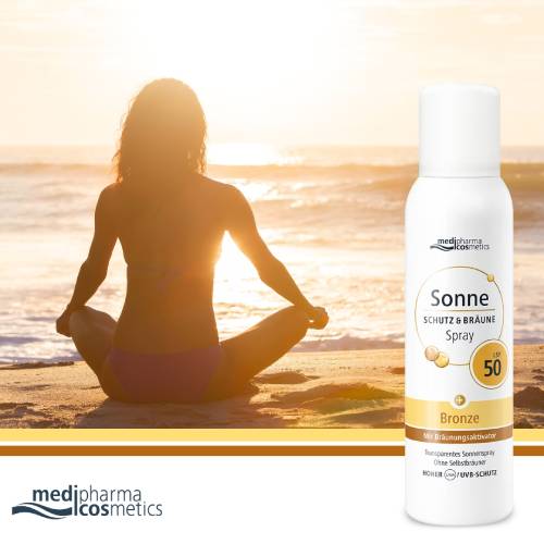 Das ultraleichte und transparente Sonnenspray Schutz & Bräune mit LSF 50 von medipharma cosmetics ist für Gesicht und Körper geeignet und bietet Sicherheit und Hautschutz auch bei intensiver Sonneneinstrahlung. Die leichte Textur zieht schnell ein, klebt und fettet nicht und ist wasserfest. Der enthaltene Pro-Melanin-Extrakt unterstützt die Melanin-Produktion und verstärkt so die natürliche Bräune ganze ohne Selbstbräuner. Vitamin E wirkt antioxidativ zur Stärkung der Hautbarriere. Das Spray ist praktisch in der Anwendung und bestens geeignet für unterwegs, da es immer und überall einfach, schnell auf die Haut aufgesprüht werden kann. Die leichte Textur fühlt sich an wie eine zweite Haut und ist nicht nur für Schwimmbad und Strand optimal, sondern auch beim Sport oder anderen Freizeitaktivitäten. Die enthaltenen hochwertigen UV-Filter sind korallenfreundlich – auf Octocrylene, Octinoxate und Oxybenzone mit umweltschädlicher und hormoneller Wirkung wird gänzlich verzichtet. So steht einem entspannten Sommerurlaub nichts mehr im Weg!