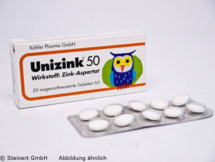 Die Unizink 50 Tabletten werden zum Ausgleich eines Zinkmangels und zur Stärkung des Immunsystems angewendet. Die Tabletten enthalten den Wirkstoff Zinkaspartat, einen Lieferanten für den Mineralstoff Zink. Beim Zinkasparatat handelt es sich um eine Wirkstoff-Kombination aus Zink und der körpereigenen Aminosäure Asparaginsäure, wobei durch diese Kombination das Zink vom Körper sehr gut verwertet werden kann. Die hohe Bioverfügbarkeit dieser Verbindung garantiert, dass der Wirkstoff schnell vom Körper aufgenommen werden kann. Die Unizink 50 Tabletten sind in der Lage den Stoffwechsel von Haut, Haar und Nägeln, sie sorgen für deren Wachstum und die Zellerneuerung zu beeinflussen.