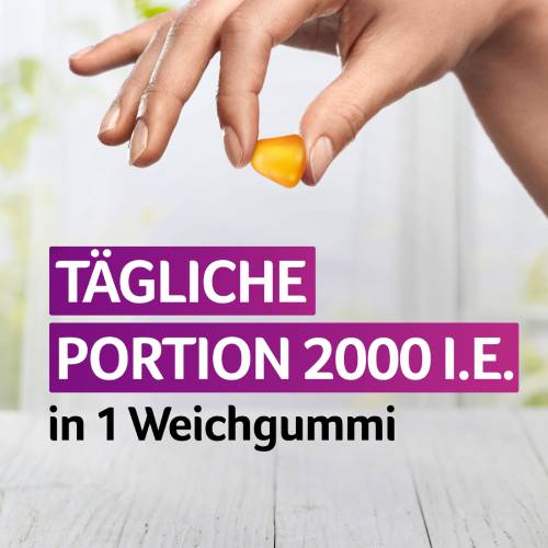 Verzehrempfehlung für Erwachsene: 1 Weichgummi (2000 I.E.) täglich.
