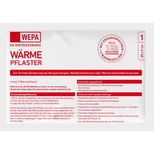 Das Wärmepflaster von WEPA bietet vielfältige Anwendungsmöglichkeiten, z. B. im Nacken, am Rücken, an der Schulter oder am Unterleib. Es dient zur Schmerzlinderung bei Verspannungen, Muskelschmerzen und Menstruationsbeschwerden.