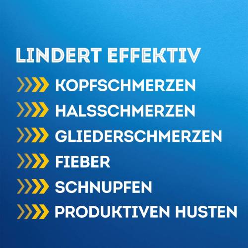 - GEZIELTE WIRKSTOFFE GEGEN ERKÄLTUNGSSYMPTOME: Paracetamol (Schmerzmittel) zur Linderung von Kopf-, Hals- und Gliederschmerzen sowie Fieber, Guaifenesin zur Schleimlösung bei produktivem Husten sowie Phenylephrinhydrochlorid, ein abschwellendes Mittel bei verstopfter Nase.