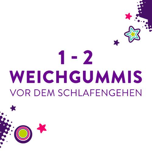 - Verzehrempfehlung: 1 - 2 Weichgummis 30 Minuten vor dem Schlafengehen einnehmen, mind. 6 Stunden Schlaf danach ermöglichen, Einnahme nach Bedarf von max. 2 Weichgummis pro Tag, für Kinder ab 4 Jahren